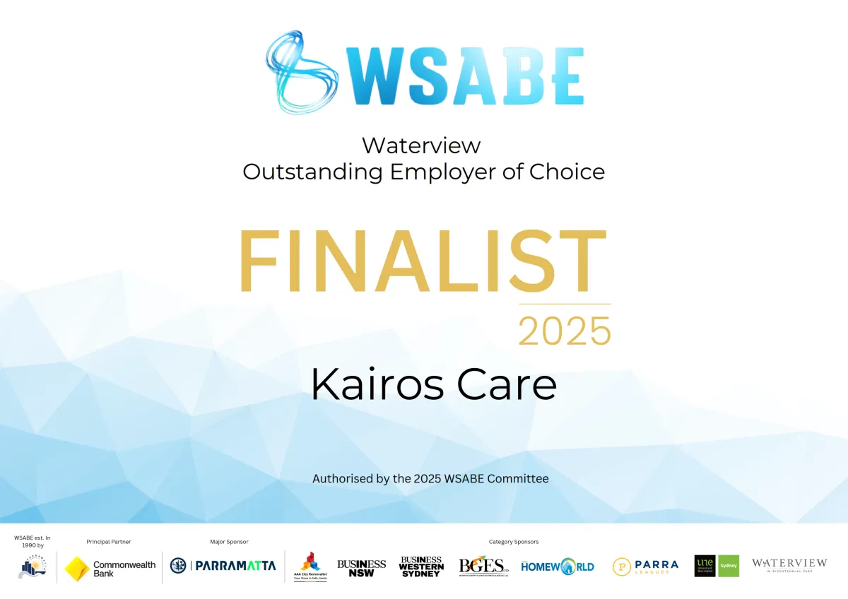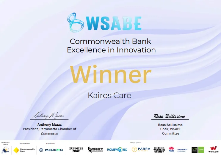 As the Western Sydney representative in the Excellence in Innovation category, Kairos Care was recognised by the Business NSW Awards for pioneering solutions that drive meaningful progress across the state — showcasing creativity, impact, and forward-thinking approaches to real-world challenges.